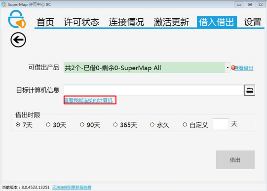 SuperMap 8C(2017) 许可支持从网络软许可中借出到网络其他计算机中的功能,应用于该计算机临时或长期不能连接许可服务器的情况。